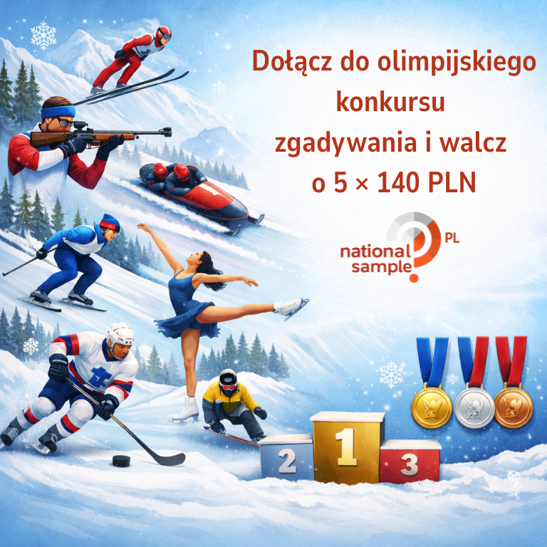 6. SPOSÓB WYŁONIENIA ZWYCIĘZCÓW: Zwycięzcą jest członek National Sample PL, który zarejestrował się i pomyślnie przeszedł weryfikację najpóźniej do 9 lutego 2026 r., wziął udział w konkursie zgadywania i prawidłowo określi: ile rekordów olimpijskich zostanie pobitych podczas nadchodzących Zimowych Igrzysk Olimpijskich 2026 we Włoszech (łącznie we wszystkich sportach i konkurencjach). Wszyscy respondenci spełniający te warunki zostaną objęci losowaniem, w którym wyłonionych zostanie łącznie 5 zwycięzców.